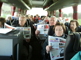 Bei der EuroBus-Leserreise “ Highlights des Nordens – von Hamburg zum Müritzsee“ ist natürlich auch der brandaktuelle EuroBus als informative Bord-Lektüre mit an Bord. Die Reiseteilnehmer bringen sich zwischen den einzelnen Reisestationen auf den neuesten Stand der Ereignisse und diskutieren untereinander über die Themen – etwa über die bei der RDA-Tagung am vergangenen Wochehende angeregte Image-Kampagne, die ja jetzt keine werden soll, aber dann doch wieder... nur etwas anders.... Auf jeden Fall gibt es eine Menge Gesprächsstoff für unterwegs, sodass die Gruppe bester Laune die nächste Station der mit Highlights gespickten Leserreise angehen kann: Eine Schifffahrt mit der Weißen Flotte auf der Müritz ! Wir werden an dieser Stelle weiter über die EuroBus-Leserreise berichten!
