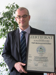 „Die Weltenbummler“ sind als zweiter TOP-Reiseveranstalter von tourVERS ausgezeichnet worden. Nach Schauinsland-Reisen darf sich nun auch „Die Weltenbummler GmbH“ aus Erfurt „TOP-Reiseveranstalter“ nennen und mit dem bei der ITB erstmals vorgestellten Zertifikatssiegel des führenden Insolvenzverdsicherers werben. Das Unternehmen hat die umfangreiche Prüfung der wirtschaftlichen und touristischen Kriterien mit einem überdurchschnittlichen Ergebnis bestanden. Damit ist der Busreiseveranstalter der erste Thüringer Veranstalter, der die Auszeichnung erhält.