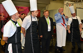 Ein besonderes Highlight war der Gourmet-Abend am zweiten Tag mit über 160 Menüs, die vom Chefkoch des Royal Palace, Bruno Schlewitz herausgegeben wurden. „Unserem gesamten Team haben danach zwar die Füße wehgetan, aber es war wieder eine tolle Erfahrung. Das Kundenecho war hervorragend“, berichtet Joachim Schweda. (Unser Foto zeigt denTouren-Service-Stand am Gourmet-Abend. Bruno Schlewitz, Joachim Schweda, Pierre Meyer (Inhaber Royal Palace), Koch-Team (von rechts). Foto: Berghoff).
