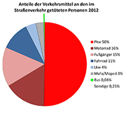 Mit nur drei Verkehrstoten (3 =0,08%) im vergangenen Jahr schneidet er noch vor Moped/Mofa (93 . 3%), Lkw (154 = 4%), Fahrrad (406 . 11%), den Fußgängern (520 =15%), dem Motorrad (586 =16%) und weit vor dem Pkw mit 1791 getöteten Personen ( 50%) ab.