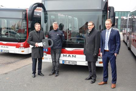 Schon das zweite Mal im Jahr 2016 durfte Thomas Flentge, Key Account Manager ÖPNV Vertriebsregion Nord bei der MAN Truck & Bus Deutschland GmbH, für eine Fahrzeugübergabe nach Braunschweig fahren. Mitte Dezember übergab er den symbolischen Zündschlüssel für acht neue MAN Lion‘s City an den Braunschweiger Oberbürgermeister Ulrich Markurth und den Geschäftsführer der Verkehrs GmbH, Jörg Reincke (Foto: MAN Truck & Bus).
