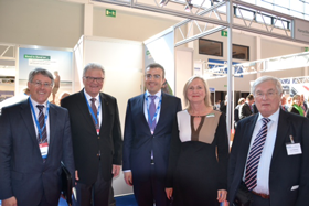 Beim anschließenden Messerundgang der geladenen Ehrengäste (hier am Stand der HanseMerkur mit Susanne Löbkens) konnten sich auch Stephen Smith (l., Chairman der EACT) und “Mr. Busworld“ Luc Glorieux (r.) ein erstes Bild von dem Angebot der Aussteller machen.