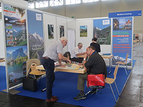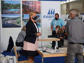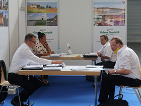 An den Ständen dürfen die Masken abgesetzt werden, was die Kommunikation erleichtert. Doch auch in den Gängen finden Gespräche statt – es geht auch mit Masken. „Wir müssen einfach neue Wege gehen“, wie ein Busreiseveranstalter sagt.