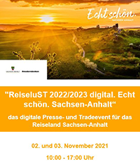 Geheimtipps und die besten Urlaubsangebote im Reiseland Sachsen-Anhalt gesucht? Jede Menge Inspiration für die Planung der nächsten Reisesaison gibt es bei „ReiseluST 2022/2023 digital. Echt schön. Sachsen-Anhalt“ am 2. und 3. November 2021 jeweils von 10-17 Uhr. Das Presse- und Tradeevent wird von der Investitions- und Marketinggesellschaft Sachsen-Anhalt mbH organisiert. Mit dabei sind zahlreiche Vertreter und Anbieter aus allen fünf Reiseregionen, darunter dem Harz, der Altmark, der WelterbeRegion Anhalt-Dessau-Wittenberg, der Saale-Unstrut-Region sowie Magdeburg und Region.