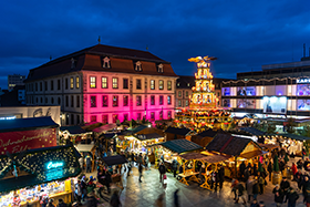 Am 26. November eröffnet in diesem Jahr der traditionelle Weihnachtsmarkt in Fulda (Foto oben © Stadt Fulda/CTech). Im Herzen der Barockstadt, rund um den Universitätsplatz finden sich bunte Stände (Foto unten, © Stadt Fulda/CTech), regionale Spezialitäten und kulinarische Köstlichkeiten, dazu ein Kinderweihnachtsland, ein mittelalterliches Weihnachtsdorf, der Winterwald und als neues Highlight die „Fuldaer Eiszeit“. Bis zum 23. Dezember ist der Weihnachtsmarkt täglich von 11 bis 20 Uhr geöffnet, der Winterwald öffnet auch nach den Weihnachtsfeiertagen noch einmal vom 27. bis zum 30. Dezember.