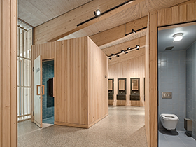 Als im Jahre 2015 mit der Planung eines Neubaus begonnen wurde, hat man über 2 000 Gäste-Befragungen ausgewertet um die Bedürfnisse in die Planung einbeziehen zu können. Das Resultat spiegelte sich bei der Neueröffnung im Mai 2018 wider. Die große und außergewöhnliche Toilettenanlage (Foto unten, © Roger Frei) wird nicht wie üblich im Keller versteckt, sondern befindet sich im Ersten Obergeschoss mit über 600m2 sowie einem herrlichen Ausblick auf die Berge und den Fluss.