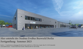 Omniplus, die Servicemarke von Daimler Buses, errichtet ein neues Servicezentrum für Mercedes-Benz und Setra Omnibusse mit umfassendem Leistungsspektrum und großer Kapazität, wie Daimler Truck mitteilt. Eröffnung für das neue BusWorld Home (BWH) in Berlin ist voraussichtlich im Juni kommenden Jahres (Foto: Bauplakat, © Daimler Truck).