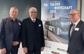 Auf der Mitgliederversammlung des Bundesverbands Deutscher Omnibusunternehmen (bdo) wurde bdo-Präsident Karl Hülsmann einstimmig im Amt bestätigt. Ebenso wurden die bisherigen Vorstandsmitglieder Mario König (MDO), Hans Gassert (LVS) und Karl-Reinhard Wissmüller (LHO) erneut gewählt. (Foto darunter). Auch die Rechnungsprüfer Lisa Bischoff, Claudio Kastner und Steffi Lehmann (Stellvertretung) erhielten das Vertrauen der Delegierten und wurden in ihren Funktionen bestätigt.