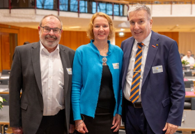 Zum Thema Antriebswende berichtete WBO-Vorstandsmitglied und bdo-Vizepräsident Ulrich Rau anschaulich und praxisnah über die Erfahrungen, die sein Unternehmen, die OVA-Omnibus-Verkehr Aalen, jüngst bei der Implementierung ihrer E-Busflotte und dem Bau der adäquaten Ladeinfrastruktur sammeln konnte. Und er wagte einen Ausblick auf der Grundlage der inzwischen erworbenen Learnings. Erkenntnisse, die auch den Protagonisten der sich anschließenden Urkundenverleihung nicht fremd waren. Viele WBO-Mitgliedsunternehmen sind auf dem Weg der Transformation bereits ein gutes Stück vorangeschritten und leisten damit vorbildlich ihren Beitrag zum Klimaschutz im Verkehr. Dies galt es, mit der Urkunde für die Antriebstransformation entsprechend zu würdigen und sichtbar zu machen. 35 Unternehmen aus den Reihen der WBO-Mitglieder erhielten die Auszeichnung für ihr vorbildliches Engagement bei der Umstellung ihrer Fahrzeugflotten auf batterieelektrische Antriebe und bei der Errichtung der Ladeinfrastruktur. (Foto unten: v.l. WBO-Präsident Franz Schweizer, WBO-Geschäftsführerin Yvonne Hüneburg und UBW-Präsident Thomas Bürkle (c: WBO)).