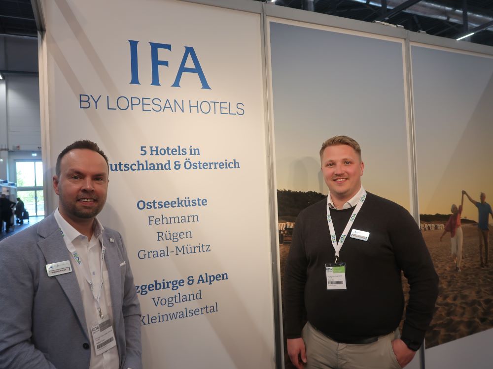 (lop) „Das bei Busgruppen begehrte IFA Hotel Fehmarn befindet sich gerade in der Renovierungsphase und wird im April 2027 wieder eröffnet und kann bereits gebucht werden“. Mit dieser von vielen Busreiseveranstaltern heiß ersehnten Nachricht ist Vojtech Tucek, Head of Group Sales (auf dem Foto links neben Sales Manager Nicolas Heuß, c: lop) nach Köln zur RDA Expo gekommen. Nicht von ungefähr ist dieses IFA Hotel am Ostseestrand gerade bei Busunternehmen stark nachgefragt, bietet es doch für alle Zimmer Balkon und Meerblick. Im Inneren werden die Bäder mit bisher Badewannen durch Duschen ersetzt und Restaurant, Rezeption und Lobby komplett renoviert. Bereits einer umfassenden Renovierung unterzogen wurden die IFA Hotels Graal-Müritz und Rügen.