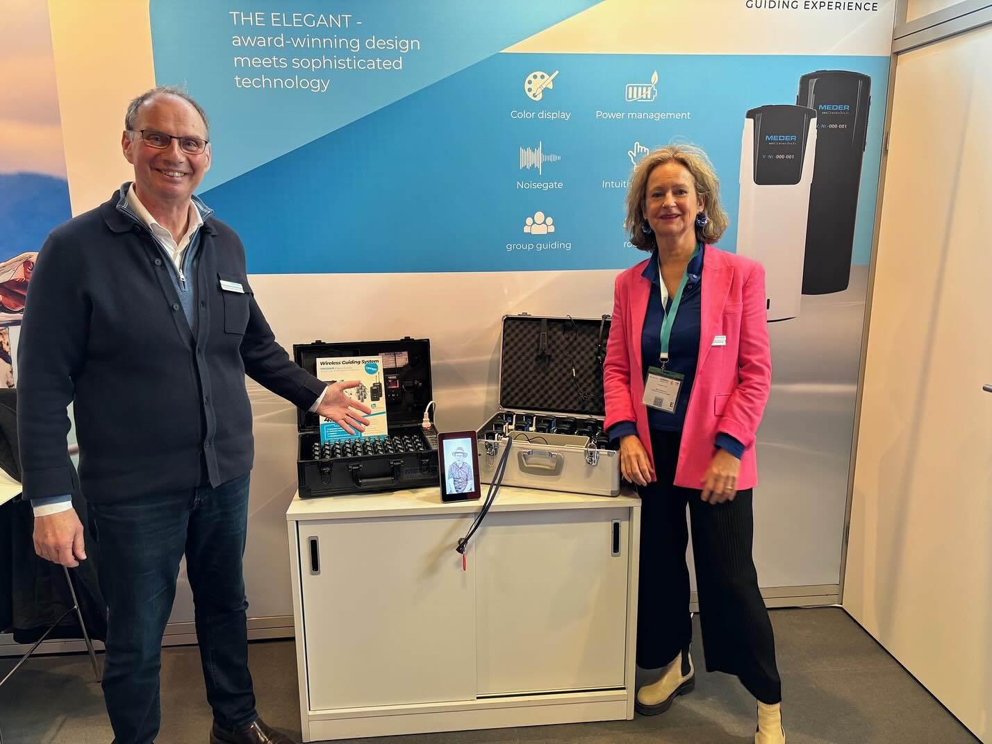 In Halle 6.1, Stand 325 präsentieren u.a. Christian Bitzer und Silke Schumme (Foto, v.l.n.r., (c) coe) die Produkte von Meder Comm Tech: im Fokus stehen vor allem der Easy Guide – mit einem speziellen ITB-Angebot – und der Basic Guide 2.