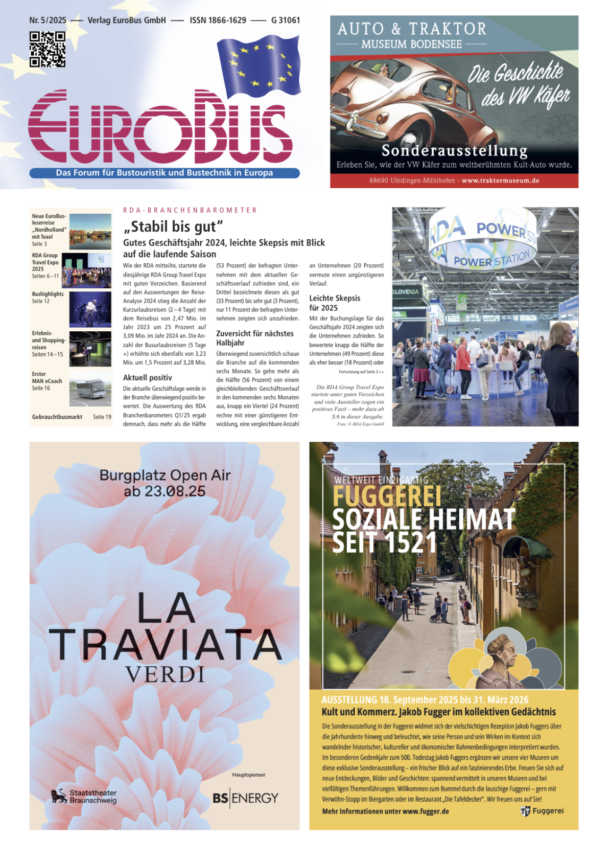Die neue Ausgabe des EuroBus ist da! Neben spannenden Branchenthemen wie dem RDA-Branchenbarometer und einem großen Nachbericht zur RDA Group Travel Expo 2025 erwarten die Leser viele weitere Highlights rund um Busreisen, Digitalisierung und Fahrpersonalmangel.