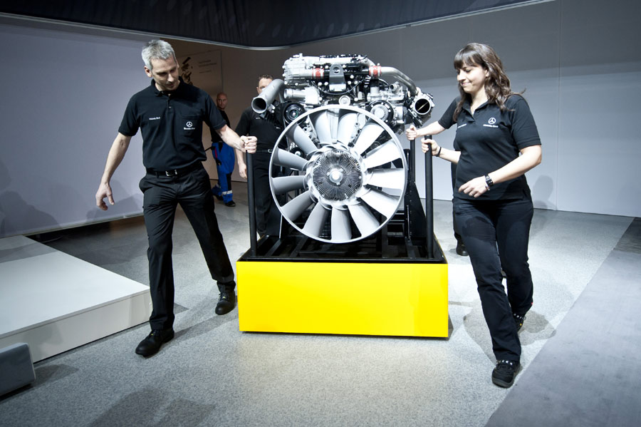 Premieren für saubere Luft: Daimler und Scania stellten jetzt erste Nutzfahrzeug-Motoren entsprechend der Abgasnorm Euro 6 vor. Die gilt für neue Fahrzeugtypen ab 1.1.2013, für Neuzulassungen bestehender Baureihen ab 1.1.2014. Bei beiden Herstellern handelt es sich zunächst um stehende Reihenmotoren, wie sie über schwere Lkw hinaus auch in Reisebussen eingesetzt werden. Seitens Mercedes ist dies die Baureihe OM 471 in der 12,9 l-Version mit einer Leistungsspanne von 310 kW (421 PS) bis 375 kW (510 PS) und maximalen Drehmomenten zwischen 2100 und 2500 Nm. Die Grundkonstruktion der Reihensechszylinder basiert auf der gemeinsam mit Detroit Diesel entwickelten Plattform der Heavy-Duty-Motoren, die sich bereits in Freightliner-Trucks und bei Fuso bewährt haben. Für das Lkw-Segment ist zu erwarten, dass die Nutzfahrzeughersteller den frühen Euro 6-Einstieg durch eine vorzeitige Mautregelung erreichen wollen, weshalb vermutlich auch politisch interveniert wird. Dagegen dürfte im Bus zunächst nur der höhere Wiederverkaufswert Anreize setzen. Wer die ersten liegenden Euro 6-Motoren für Stadtbusse vorstellt, wird man ggf. zur Busworld im Herbst 2011 sehen.