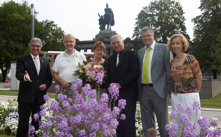 Im närrischen Rheinland sind „Schnapszahlen“ von großer Bedeutung. Entsprechend wurde die 555.555ste BUGA-Besucherin, die am heutigen Vormittag am Eingang Kastorbasilika die Bundesgartenschau Koblenz 2011 betrat, mit großer Freude gefeiert. Neben Oberbürgermeister Prof. Dr. Joachim Hofmann-Göttig und BUGA-Geschäftsführer Hanspeter Faas wohnte auch der neue rheinland-pfälzische Innenminister Roger Lewentz am Tag seines Amtsantritts diesem Ereignis bei. Die niederländische Radtouristin Bouwien Folgerts aus Wyk by Duurstede nähe Utrecht und ihr Mann Albert freuten sich über den freundlichen Empfang, einen großen Blumenstrauß und eine Geschenk-Box mit kulinarischen Köstlichkeiten aus der Region.