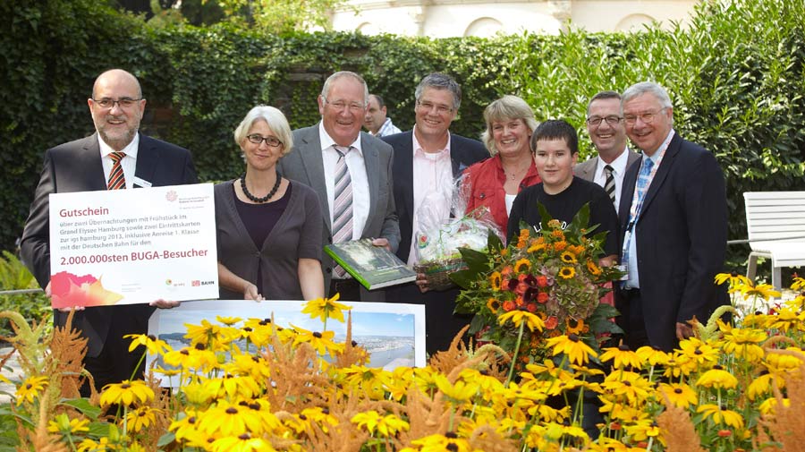 Mit insgesamt zwei Millionen Besuchern an den 185 Veranstaltungstagen hatten die Verantwortlichen der Bundesgartenschau Koblenz 2011 kalkuliert. Dieses Ziel konnte bereits am zurückliegenden Wochenende erreicht werden – also schon zweieinhalb Monate vor Ende des grünen Großevents an Rhein und Mosel. Gemeinsam mit dem Koblenzer Oberbürgermeister Prof. Dr. Joachim Hofmann-Göttig begrüßte BUGA-Geschäftsführer Hanspeter Faas am Eingang Kastorkirche den 11-jährigen Yannick Friedrich aus Blankenrath an der Mosel als zweimillionsten Besucher. Von der internationalen Gartenschau (igs) Hamburg 2013, von Vertretern der Deutschen Bahn und des grünen Berufsstandes erhielt der junge Mann neben weiteren Präsenten einen Gutschein für eine Reise in die Hansestadt. Hier findet vom 26. April bis 13. Oktober 2013 eine internationale Gartenschau (igs) statt.