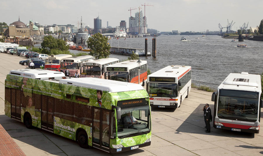Flüsterleise und ohne Schadstoffe kommt der Bus der Zukunft in Hamburg an. Die Hamburger Hochbahn AG hat im Rahmen des deutschen Förderprojekts „NaBuZ demo“ (Nachhaltiges Bussystem der Zukunft - Demonstration) vier Mercedes-Benz Citaro Fuelcell-Hybrid angeschafft. Weitere drei sollen im nächsten Jahr folgen. „Mit den neuen Fuelcell-Hybrid-Fahrzeugen übernimmt Hamburg wieder die Vorreiterrolle auf diesem Gebiet. Der Verkehrsbetrieb hat sich bereits mit der Erprobung von Brennstoffzellenbussen aus der Vorgängergeneration in Europa einen Namen gemacht und gute Erfahrungen gesammelt. Auch Fahrgäste und Fahrer waren begeistert“, so Hartmut Schick, Leiter Daimler Buses, bei der Übergabe. Dank der verbesserten Brennstoffzellenkomponenten und der Hybridisierung mit Lithium-Ionen-Batterien spart der neue Citaro Fuelcell-Hybrid im Vergleich zur Vorgängergeneration fast 50 Prozent Wasserstoff. Deshalb konnte die Anzahl der Tanks gegenüber den in Hamburg früher erprobten Brennstoffzellenbussen von neun auf sieben Behälter mit zusammen 35 kg Wasserstoff reduziert werden. Die Reichweite des Brennstoffzellenbusses beträgt rund 250 Kilometer. Mit diesen vielfältigen technischen Fortschritten kommen rein elektrische Omnibusse mit Brennstoffzellen als Energieerzeuger der Serienreife einen deutlichen Schritt näher.