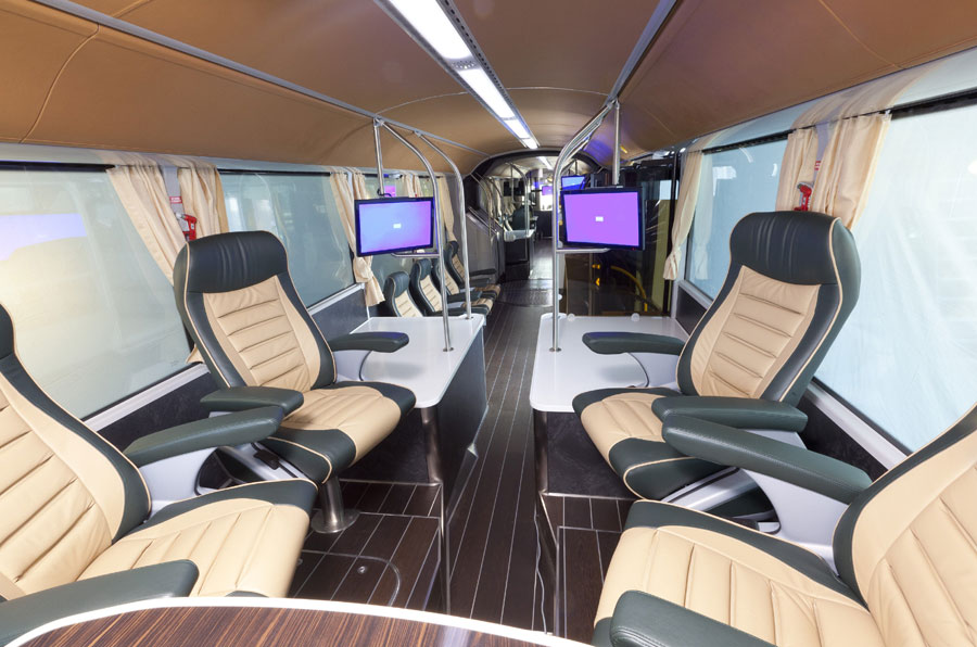 Der niederbayerische Busbauer Viseon liefert den weltweit ersten Trolley-Bus mit exklusiver VIP-Ausstattung an das saudische Königshaus in Riad/ Saudi-Arabien – ein Bus aus „Tausendundeiner Nacht“. Der Oberleitungsbus mit Echtholz-Boden, Leder bespannter Innendecke und bequemen Ledersesseln ist Teil eines Auftrags der König Saud Universität über zwölf Trolleybusse des Typs Viseon LT20. Die elektrisch angetriebenen Gelenkbusse im topmodernen Viseon-Design werden künftig auf dem neu errichteten Universitätscampus vor den Toren der saudi-arabischen Hauptstadt im Minutentakt für einen lokal emissionsfreien und geräuscharmen Personennahverkehr sorgen. Schon durch ihr außergewöhnlich dynamisches Design, die vollständig für den elektrischen Antrieb optimierte Fahrzeugtechnik und die Länge von 19,50 Meter setzen die von Viseon entwickelten Trolleybusse neue Maßstäbe im Öffentlichen Personennahverkehr. Das Tüpfelchen auf dem i setzt jedoch ein mit einer exklusiven VIP-Ausstattung versehener Oberleitungs-Gelenkbus, der künftig Angehörige des saudischen Königshauses und prominente Gäste auf dem Universitätsgelände befördern soll. Erstmals hat das Customizing-Team einen Trolley-Gelenkbus mit hochwertigsten Materialien und Interieurs zu einem Fahrzeug der Luxusklasse veredelt. Beim Betreten gerät man in eine neue Bus-Welt, quasi aus “Tausendundeiner Nacht“. Mehr darüber im nächsten EuroBus!