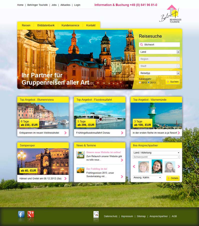 Nach intensiver Entwicklungsarbeit ist in diesem Monat die neu gestaltete Website von Behringer Touristik online gegangen, ideal für die Verkaufssaison 2013. „Auch wenn die bisherige, mehrfach prämierte Website mit ihrem zeitlosen Design selbst auf modernen Tablets noch immer gut zu bedienen war, so gilt für Behringer Touristik auch im Online - Bereich die Maxime, sich im Sinne seiner Kunden weiter zu verbessern“, so Tina Behringer. Dazu wurde das Feedback der Kunden, die Ideen der Mitarbeiter und das Know-How des Giessener Marketingunternehmens medialis und der Firma Bräutigam in Schmallenberg genutzt. Eine moderne, ansprechende, übersichtliche, gut zu bedienende und nützliche Website ist entstanden. So hat man Zugriff auf alle Katalogreisen, Sonderprogramme und Mailings. Über die umfangreiche, leicht zu bedienende Suchfunktion, findet man einzelne Reisen und Touren in bestimmte Regionen oder in ein gewünschtes Land genauso einfach wie z.B. alle Musik- oder Themenreisen. Wenn man lieber nur so „stöbert“, kann man die entsprechenden Blätterkataloge nutzen und so nach Reisen suchen wie in den Printmedien. Außerdem findet man unter “Ansprechpartner“ alle Behringer-Mitarbeiter, so dass der Interessent / Kunde zur netten Stimme am Telefon auch ein Gesicht hat. Bei der umfangreichen Bilddatenbank wurde u.a. die Suchfunktion und die Qualität der Bilder weiter verbessert. Dadurch hat man als eingeloggter Kunde Zugriff auf ein umfangreiches Bildarchiv mit druckfähigen Bildern, wahlweise als eps-Datei oder als jpg zum Download. Unter dem Menüpunkt Verkaufsförderung, sieht man, wie Behringer seine Kunden beim Verkauf ihrer Reisen unterstützt. Damit sich der Besuch der Website noch mehr lohnt, wurden weitere attraktive Top-Angebote aufgelegt. Unter den ersten 20 Reisen, die so über die neue Website angefragt und gebucht wurden, konnte ein zusätzlicher Freiplatz gewonnen werden. Links zu Facebook und Google+ sind ebenfalls eingebunden. www.behringer-touristik.de