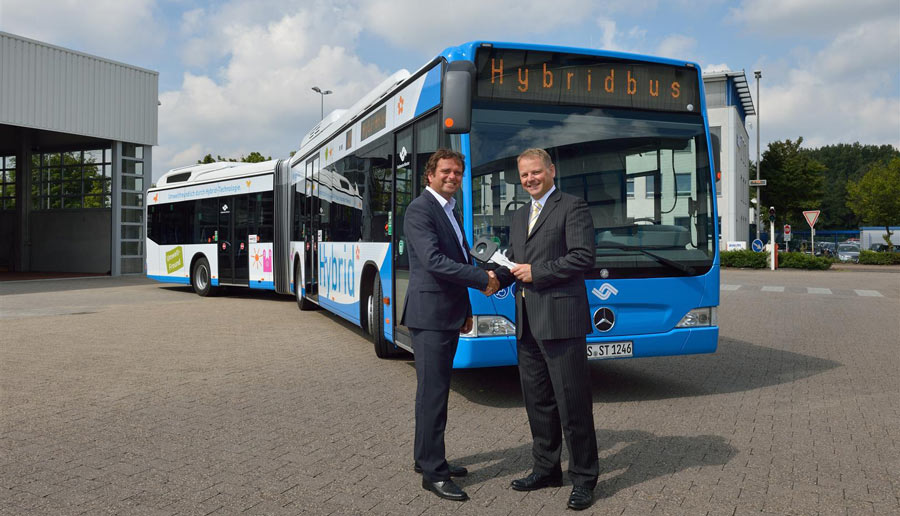 Die lebenswerteste Stadt der Welt – so darf sich Münster in Westfalen seit 2004 nennen – hat gestern offiziell ihre erste Hybridbuslinie eingeweiht. Mit der feierlichen Übergabe zweier Mercedes-Benz Citaro G BlueTec Hybrid Fahrzeuge an die Stadtwerke Münster ist die Westfalenmetropole ihrem eigenen Anspruch, mit dem Omnibus einen Beitrag zum Klimaschutz zu leisten, einmal mehr gerecht geworden. Münster ist die größte deutsche Stadt ohne städtischen, schienengebundenen Personennahverkehr. Seit Stilllegung der Straßenbahn 1954 und des Trolleybusbetriebs 1968 wird der ÖPNV ausschließlich mit umweltfreundlichen Omnibussen durchgeführt. Nahezu geräuschlos und rein elektrisch ohne Dieselmotor können die neuen Mercedes-Benz Citaro G BlueTec Hybrid den Altstadtkern passieren. Die wechselnden topografischen Gegebenheiten Münsters, der historische Altstadtkern sowie die hohe Auslastung der Linien sind ideale Bedingungen, um von der fortschrittlichen Hybridtechnik zu profitieren. Bei dem Citaro G BlueTec Hybrid handelt es sich um den bislang einzigen Hybridbus, der Streckenanteile rein elektrisch ohne Dieselmotor fahren kann und nahezu geräuschlos die Haltestelle bedient. Ohne das erwartete Motorbrummen fährt er nach dem Stopp auf der Linie über mehrere Haltestellen genauso weiter. Den Antrieb übernehmen vier elektrische Radnabenmotoren, die ihren Strom aus einer der weltweit größten Lithium-Ionen-Batterien im mobilen Einsatz beziehen. Dieser Strom wird über Bremsvorgänge gewonnen und kann bei Bedarf auch über einen Generator erzeugt werden, der durch einen für diese Fahrzeugklasse vergleichsweise kleinen Dieselmotor angetrieben wird. Experten sprechen bei diesem Konzept von einem seriellen Hybridantrieb. HighTec im Bus Dieses technologisch anspruchsvolle dieselelektrische Hybrid-Konzept ist im bewährten Gelenkzug der weltweit erfolgreichsten Stadtbusfamilie Mercedes-Benz Citaro realisiert. Äußerlich ist kein Unterschied zum herkömmlichen Dieselbus zu sehen, sieht man vom höheren Dachaufbau für die Batterie ab. Der Unterschied kommt beim Fahren. Vier Elektromotoren prägen die Fahrcharakteristik des Citaro. Nahezu lautlos und sehr zügig beschleunigen sie den 18 Meter langen Omnibus. Da kein Getriebe Anwendung findet, spürt der Fahrgast kein Rucken, wie das bei Schaltvorgängen der Fall ist. Die Radnabenmotoren bringen zusammen 320 kW Antriebsleistung, die im Bedarfsfall aus der Batterie und dem dieselmotorisch-betriebenen Generator bereitgestellt werden. Diese Elektromotoren werden auch zum Bremsen verwendet. Sie wirken dann wie Generatoren und wandeln die Bremsenergie in elektrischen Strom für die Batterie um. Meldet die Batterie einen zusätzlichen Bedarf, springt automatisch der Dieselmotor an, um zusätzlich Energie zu erzeugen. Im Vergleich zu einem reinen Dieselbus ist der Verbrennungsmotor insgesamt nur halb so groß, mit nur 450 kg statt 1000 kg Gewicht und 4,8 Liter statt 12 Liter Hubraum. Seine Leistung liegt mit 160 kW um circa ein Drittel niedriger. Als Energiespeicher wird im Mercedes-Benz Citaro G BlueTec Hybrid eine Lithium-Ionen-Batterie verwendet. Das Batteriesystem leistet max. 240 kW und ist mit einem Gewicht von weniger als 350 kg vergleichsweise leicht. Gegenüber herkömmlichen Batteriesystemen überzeugt die Batterie mit Ionen-Technologie durch eine höhere Energiedichte, verbunden mit hoher Speicherkapazität bei geringem Eigengewicht. Klimakonzept Omnibus Der Omnibusverkehr ist wesentlicher Bestandteil des Klimakonzeptes der Stadt Münster. Obschon das Busfahren an sich ein erheblicher Beitrag zum Klimaschutz ist, sollen auch die Fahrzeuge selbst den hohen Umweltanforderungen genügen. Bereits die derzeitige Gelenkbussflotte übertraf die strenge Umweltnorm Euro V. Mit dem Zuwachs der zwei Citaro G BlueTec Hybrid lösen die Stadtwerke ihr Versprechen ein, sich intensiv mit den neuen Technologien im Bereich Hybrid und Elektrofahrzeuge auseinanderzusetzen. Über 35 Mio. Fahrgäste nutzen jährlich das Angebot der Stadtwerke Münster. Mit dem Omnibusfuhrpark von 174 Fahrzeugen betreibt der Verkehrsbetrieb 24 Buslinien.