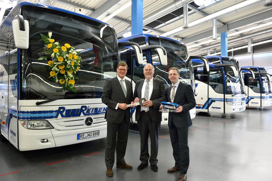 Seit 40 Jahren vertraut Rosi Reisen bereits auf Produkte aus dem Hause EvoBus. Zum diesjährigen Firmenjubiläum hat das nordrhein-westfälische Busunternehmen zehn Tourismo und zwei Travego für seine Reisebusflotte geordert. Auf unserem Bild übergibt Till Oberwörder (l.), Geschäftsführer Marketing, Vertrieb & Aftersales Daimler Buses, an Johannes-Gerd Overhoff Junior, Geschäftsführer Rosi Reisen,und Senior Overhoff. Alle Fahrzeuge tragen das auffällige Rosi-Retrodesign, mit dem die Fahrzeuge des Unternehmens Anfang der 80er Jahre auf Reisen fuhren. „Das Design der neuen Fahrzeugflotte lehnt sich an unsere Fahrzeuglackierungen der erfolgreichen 80er Jahre an. Es symbolisiert für uns Tradition und den Beginn unserer eigenen Erfolgsgeschichte“, sagte Johannes-Gerd Overhoff anlässlich der feierlichen Fahrzeugauslieferung. Rund 50 ausgewählte Reisekunden und 20 eigene Mitarbeiter und Fahrer hat Rosi Reisen mit zu dieser geschichtsträchtigen Übergabe in das Mannheimer Omnibuswerk gebracht. Hier, wo auch die Mercedes-Benz Erfolgsgeschichte für Omnibusse begann, hatte die Jubiläumsdelegation aus Marl Gelegenheit, eine der modernsten Omnibusfabriken der Welt zu besichtigen und sich ein Bild von der sprichwörtlichen Qualität zu machen. Rosi Reisen in Marl Gegründet wurde Rosi Reisen im Jahre 1972 in Marl. Namensgeberin ist Roswitha Overhoff. Die familiäre Firmenpolitik und die Nähe zum Kunden gepaart mit modernen Bussen wird Anfang der 80er Jahre zum Erfolgsrezept des Reisedienstes. Werte, die sich das Unternehmen bis heute behalten hat. Das aktuelle Rosi-Retrodesign der neuen Reiseflotte soll diese Kernkompetenzen offen zur Schau tragen. Bis auf wenige Ausnahmen findet man heute im Fuhrpark ausschließlich Produkte deutscher Marken. Mit der Anschaffung der 12 Mercedes-Benz Reisebusse befindet sich kein Fahrzeug mehr im Bestand, das älter als ein Jahr ist. Neben 25 Reisebussen betreibt Rosi Reisen 60 Überland- und Linienbusse. 85 Mitarbeiter arbeiten in den Dienstleistungsbereichen Buscharter, Großveranstaltungslogistik, Urlaubsreisen, Gruppenreisen, Schülerverkehr, Messe- und Shuttleservice.