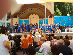 Die Reiseteilnehmer genieĂen gerade bei strahlendem Sonnenschein einen Live-Auftritt eines Kinderchors aus dem Showprogramm im Europa-Park.