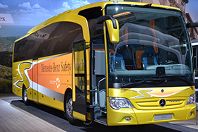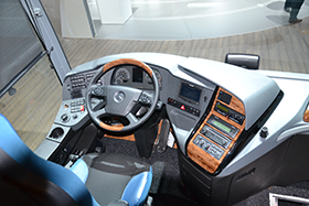 Derzeit soll es keinen sichereren und wirtschaftlicheren Premium-Hochdecker Reisebus geben als diesen in Halle 14/15 gezeigten Mercedes-Benz Travego. Ausgerüstet mit Abstandsregeltempomat mit Zusatzfunktion Stop-and-Go und mit dem vorausschauenden PPC Tempomat, der Kraftstoff spart, gilt er als Maßstab für Spitzentechnik im Reisebus.