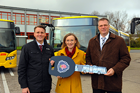 Auf unserem Foto bei der Übergabe v.l.: Alexander Vlaskamp, Geschäftsführer Scania Deutschland Österreich, Dr. Sigrid Evelyn Nikutta, Vorstandsvorsitzende und Vorstand Betrieb BVG und Martin Koller, Bereichsleiter Omnibus BVG.