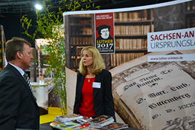 Bei der Jahrestagung des baden-württembergischen Busunternehmerverbands WBO stellte Anette Seidel (Foto) am Stand von Sachsen-Anhalt detailliert ausgearbeitete Bustouren für ganz Sachsen-Anhalt vor. Darin enthalten die wichtigsten Gedenkstätten in Wittenberg, wo der Mönch Luther seine 95 Thesen gegen den Ablasshandel an das Portal der Schlosskirche schlug, sein Geburts- und Sterbehaus in Eisleben, sein Schulort Mansfeld, Magdeburg als Bollwerk des Protestantismus, Dessau als Wohnstätte seines Freund und Gönners Fürst Georg III. von Sachsen-Anhalt und Halle an der Saale, wo Luthers mächtiger Gegner Kardinal Albrecht von Brandenburg residierte.