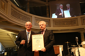 Unser Foto zeigt tourVERS-Geschäftsführer Michael Wäldle (l.) bei der Zertifikatsübergabe an Ulrich Basteck, Geschäftsführer von Wörlitz Tourist.