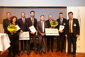 Auf unserem Foto die Preisträger: Stadt Böblingen, Reinhardt Schopf (l.), OVR, Horst Windeisen (3.v.r.), Landkreis Calw, Michael Stierle, (2.v.r.) und Arno Ayasse, ganz rechts vom Busunternehmen Rexer. Die Preise überreichte Ministerialdirektor Uwe Lahl (M).(Foto: MVI/Uwe Nüssle).