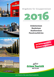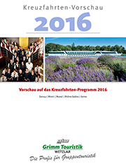 Im Gruppentourismus hält die Tendenz, größere Rundreisen und Flusskreuzfahrten frühzeitig zu buchen, unvermindert an. Paketreiseveranstalter Grimm Touristik Wetzlar hat daher zwei neue Vorschau-Kataloge herausgegeben, die bereits vor der Veröffentlichung des GTW - Hauptkataloges 2016 und des Kreuzfahrten-Kataloges 2016 einen umfangreichen Überblick und einen Streifzug durch Europas schönste Regionen bieten.
