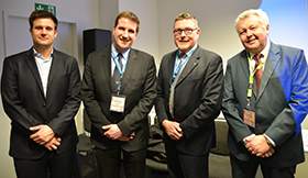 Die Referenten von l. n. r.: Jan Schubert (Bodmin Linde LNG), Frederik Erdmann (Wyker Dampfschiff-Reederei)Christian Totzeck (Vorstandsvorsitzender des VFF), Janusz Grabowski (Viking Line). / Text/Foto: Jörg Berghoff