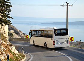 Dies nahm Daimler jetzt zum Anlass, die komplette Range an der kroatischen Magarska Riviera südlich von Split zum Testen auffahren zu lassen: Insgesamt 6 verschiedene Modelle in allen Längenvarianten vom “kurzen“ 10,3 m Tourismo K, der in Deutschand beim Trend zu kleineren Reisegruppen seine Liebhaber gefunden hat, über die 12 m langen Tourismo Reisehochdecker für Shuttle- und Fernlinieneinsatz bis zum 13,96 m Dreiachser für die große Reise.