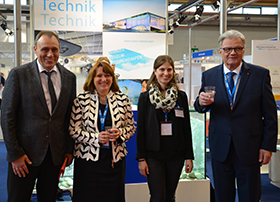 Auf einem Workshop-Rundgang wurde unter anderem Station gemacht am Friedrichshafen Stand. Mit dabei waren Andreas Köster, der amtierende Bürgermeister von Friedrichshafen, die Vorsitzende des Tourismus-Ausschusses des Deutschen Bundestages Heike Brehmer, Jennifer Brosy von Friedrichshafen Tourismus und RDA-Präsident Richard Eberhardt (von links nach rechts), die auf den Erfolg des Workshops anstießen.