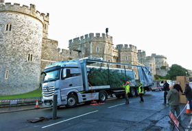 Nach der öffentlichen Verabschiedung auf dem Albertsplatz in Coburg transportierte Mercedes-Benz CharterWay den royalen Weihnachtsbaum (Foto) über die belgische Partnerstadt Oudenaarde nach Windsor Castle, wo der Mercedes-Benz Actros am späten Nachmittag des 15. November eintraf.