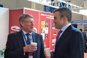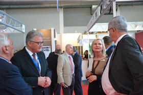 Beim anschließenden Messerundgang der geladenen Ehrengäste (hier am Stand der HanseMerkur mit Susanne Löbkens) konnten sich auch Stephen Smith (l., Chairman der EACT) und “Mr. Busworld“ Luc Glorieux (r.) ein erstes Bild von dem Angebot der Aussteller machen.