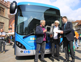 Thomas Hartmann, Geschäftsführer der Volvo Busse Deutschland, überreichte die Niederflur-Stadtbusse im Beisein von Oberbürgermeister Rolf-Georg Köhler