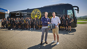 Knapp einen Monat vor dem Ende der Transferfrist kann sich der BVB über einen leistungsstarken Neuzugang freuen: Sebastian Kehl (Foto, rechts), der Leiter der Lizenzspielerabteilung, nahm symbolisch die Schlüssel für den neuen Mannschaftsbus, einen MAN Lion’s Coach von Hartmut Sander (l.), Vice President Corporate Communications bei MAN Truck & Bus entgegen.