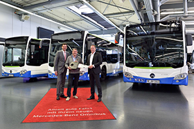 Mit den 17 Citaro haben dann insgesamt 103 Mercedes Benz Citaro die Flotten der Kooperationspartner im Ruhrgebiet verjüngt. Rüdiger Kappel (Foto, rechts) Leiter Vertrieb Flotten Deutschland, übergab die Fahrzeuge im Mannheimer Omnibuswerk an Michael Hamann, Betriebsleiter Bahnen der Stadt Monheim (links Alexander Kols, Werksbeauftragter ÖPNV).