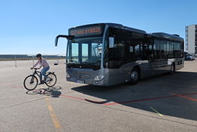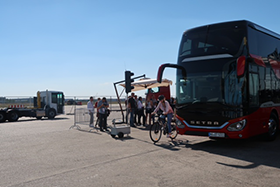 (lop) Wie wichtig Daimler die Sicherheit bei Bussen ist, wird gegenwärtig auf dem Hangar 1 des Flughafens demonstriiert. Bremsen quietschen, Busse und Lkw vollziehen eine Vollbremsung- und die Radfahrerin, die als Testperson auf der rechten Fahrzeugseite vorbei gefahren ist, bleibt unbehelligt von der Aktion und fährt weiter.