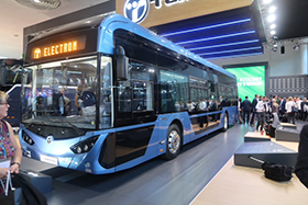 (EB) Auch Temsa präsentiert einen Elektro-Stadtbus bei der IAA: “E-Busse sind jetzt Teil unserer Busfamilie“, freute sich Hassan Yilderim, CEO des türkischen Busherstellers, bei der Vorstellung des neuen Avenue Electron. Der mit Lithium-Ionen-Batterien auf dem Dach bestückte 12m Citybus soll eine Reichweite von 350 km (!) vorweisen können und bei den Life Cycle Costs durch den Wegfall der mechanischen Komponenten unter der Summe für den dieselbetriebenen Avenue liegen.