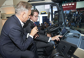 Martin Daum, Mitglied des Vorstandes der Daimler AG, verantwortlich für Daimler Trucks & Buses, Wilfried Porth, Vorstand für Personal und Arbeitsdirektor & Mercedes-Benz Vans der Daimler AG, sowie Stefan Buchner, Leiter Mercedes-Benz Lkw, hießen die Gäste persönlich willkommen und erläuterten ihnen unter anderem die Highlights des neuen Mercedes-Benz Actros (Foto), der Anfang September seine Weltpremiere feierte. Die Elektrifizierung des Nutzfahrzeug-Portfolios von Daimler spielte bei dem Rundgang ebenfalls eine wichtige Rolle.