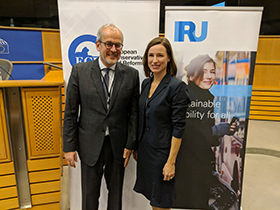 Die IRU hat dieser Tage unter aktiver Beteiligung des bdo ein parlamentarisches Mittagessen zum Mobility Package. Dabei wurden insbesondere über die Neuordnung der Lenk- und Ruhezeiten, die Entsenderegeln sowie den Zugang zum Fernbusmarkt debattiert (Foto: Anja Ludwig, stv. Hauptgeschäftsführerin des bdo mit Berichterstatter Roberts Zile / Foto: bdo).