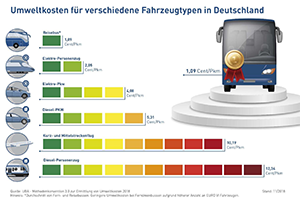 Auch wenn die Methodenkonvention den Fernbus nicht gesondert ausweist, wird deutlich, dass die Umweltkosten von Fernlinienbussen aufgrund des hohen EURO VI-Anteils sogar noch niedriger sind als der vom UBA betrachtete Durchschnitt der Reisebusse. Die folgenden Zahlen verdeutlichen den erheblichen Abstand zu den anderen Verkehrsmitteln: