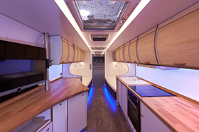 Ein Blick in den luxuriösen Innenraum (Fotos: MAN) zeigt: Der individuell im BMC ausgebaute Bus lässt keine Wünsche offen. Federbett statt Isomatte und Luxusküche statt Gaskocher: „Unser Ziel war es, dass die Besitzer auf nichts verzichten müssen. Deshalb haben wir großen Wert auf hochwertige Materialien, durchdachte Lösungen und ein tolles Design gelegt.“ sagt Heinz Kiess, Leiter Sales & Marketing beim BMC
