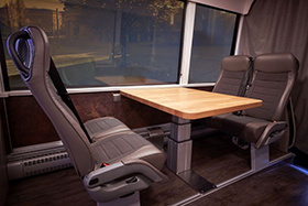 Ausgestattet ist der Reisebus zudem mit drei 5 kW Ladewechselrichtern, vier Li-Ionen-Batterien, einem Batteriemanagementsystem, einem leistungsstarken Generator, WLAN, dem Kamerasystem BirdView, einer SAT-Anlage und einem Skikoffer. Zudem wurden für die Wasserversorgung ein Frischwassertank mit 920 l sowie ein Grauwassertank mit 520 l Fassungsvermögen speziell angefertigt. „Um die erhöhten statischen Ansprüche im Bereich Dach und Kofferraum gerecht zu werden, haben unsere Experten darüber hinaus das Busgerippe modifiziert“, so Kiess.