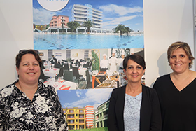 Bei der RDA Expo Köln erläutern General Manager Paola Degiovanni (Foto, links) und Sales Manager Mara Patrone (r.) mit Dolmetscherin Tiziana Panizza die Angebote des busfreundlichen Gruppenhotels.