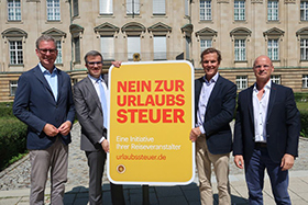 (lop) Heute morgen, 11 Uhr, Ortstermin Bundesfinanzhof München. Vor dem 3. Senat des obersten deutschen Steuergerichts wird das Revisionsverfahren in Sachen Frosch Reisen aufgerufen. Über 30 Bus- und Reiseveranstalter sowie Verbandsvertreter aus Touristik sind von teils weither angereist, um ein doch richtungsweisendes Urteil zu dem die Branche belastenden Thema der gewerbesteuerlichen Hinzurechnung des Einkaufs von Hotelleistungen zu vernehmen. Darunter RDA-Präsident Benedikt Esser, DRV-Präsident Norbert Fiebig und BTW-Generalsekretär Michael Rabe, (die auf dem Foto mit Klaus Franke, CFO von DER Touristik Central Europe, rechts, mit Protestplakat vor dem Bundesfinanzhof ihre Meinung sichtbar kund tun, Foto: Lopuszansky).