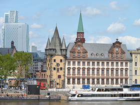 Zwischen Untermainbrücke und Alte Brücke werden Teile des Mainkais und des Untermainkais ab 29. Juli 2019 für den Autoverkehr gesperrt. Die Sperrung gilt zunächst probeweise für ein gutes Jahr bis zum Museumsuferfest 2020 (Foto: Blick auf die Altstadt mit dem Historischen Museum, c: Tourism + Congress Frankfurt/M.).