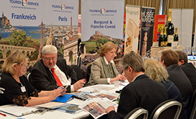 Auf dem Bus Travel Business Workshop BTB in der Stadthalle Erding ist Touren Service Schweda am 2. September 2019 am Stand 77 vertreten und präsentiert dort seine neuesten Reiseprogramme für frankophone Länder 2020 und attraktive Workshop-Specials (Foto: Anne Lecat-Schweda und Joachim Schweda bei der BTB im Vorjahr, c: PRB).